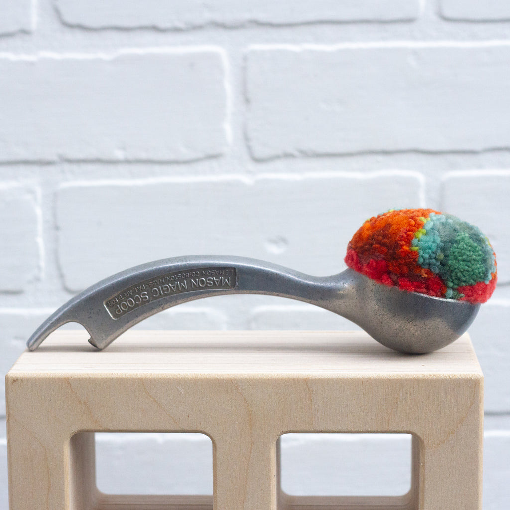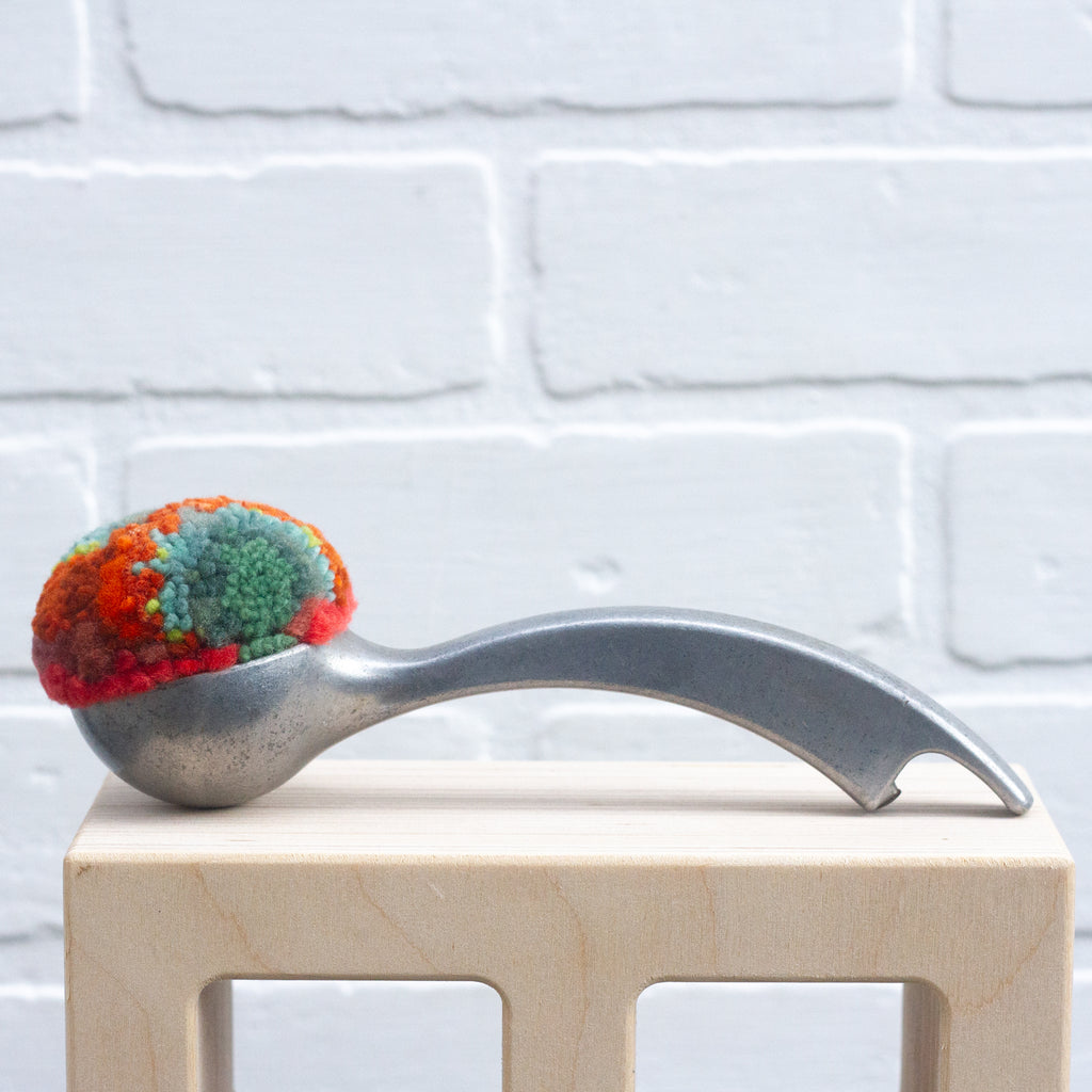 The Puff Collection has been an exploration into my way of framing fiber art and combining my love of fiber with a love for all things vintage - especially vintage metal in this case of the ice cream scoops.