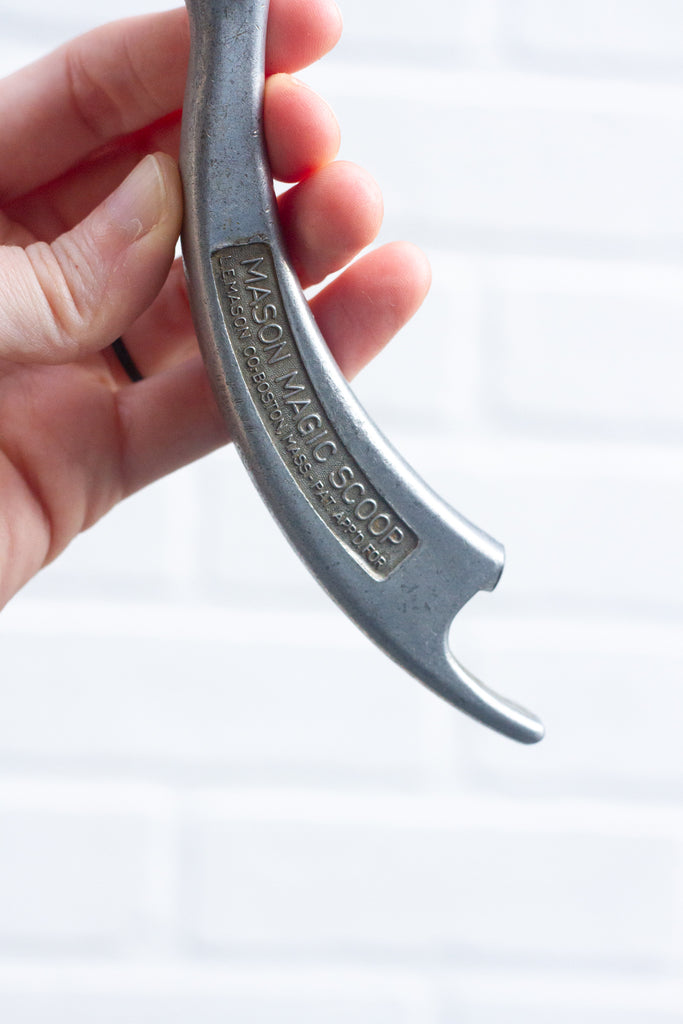 This scoop is PURE JOY!  The arch handle is chunky and sleek at the same time. It was originally a scoop/bottle opener!