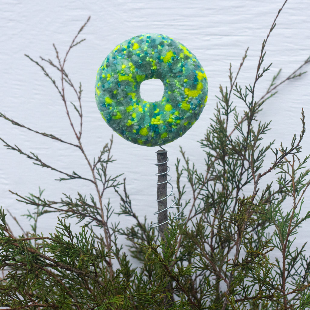 "Puffs" have been an exploration into my way of framing fiber art + this donut shape was just begging to become a tree topper.  I am so excited for how fun this turned out!