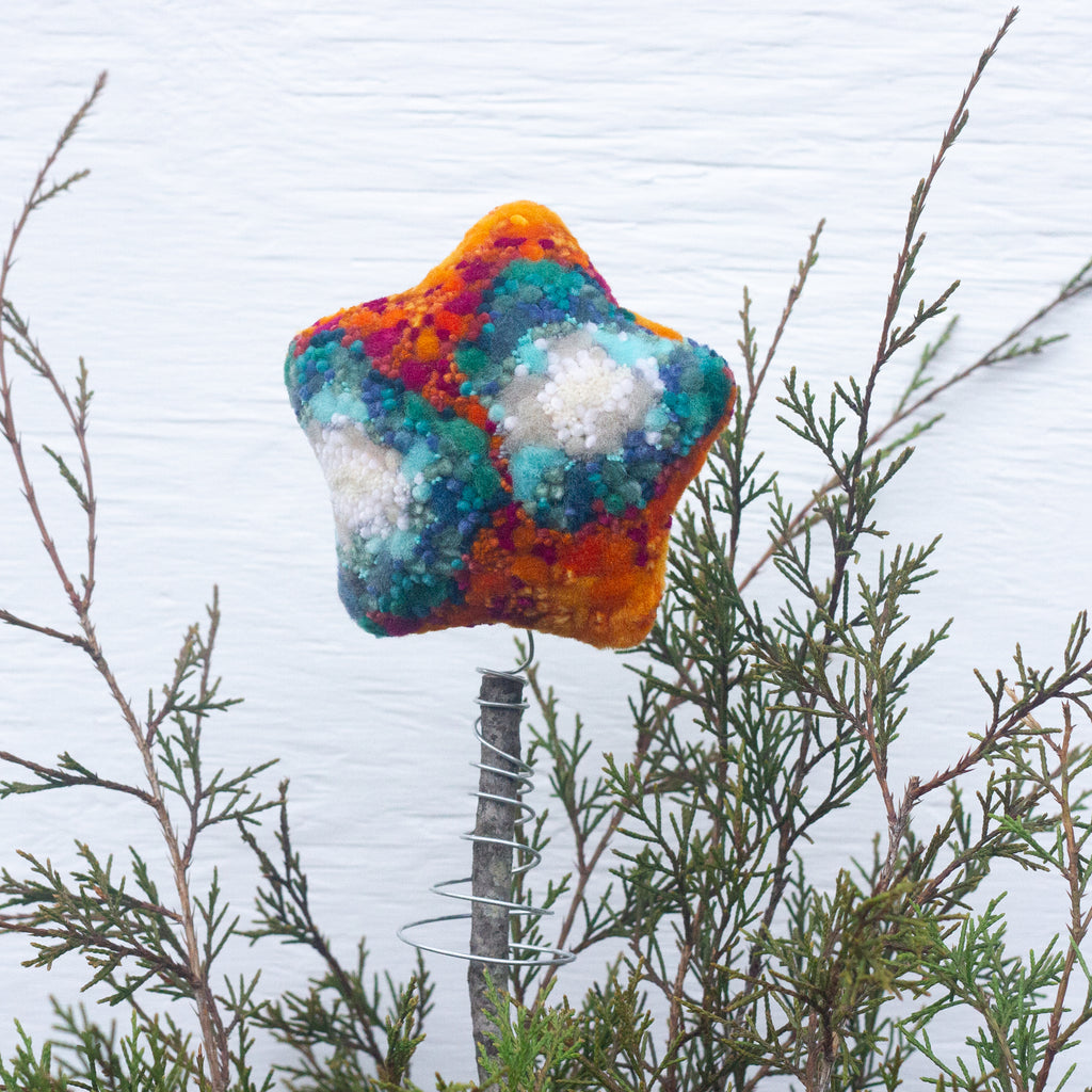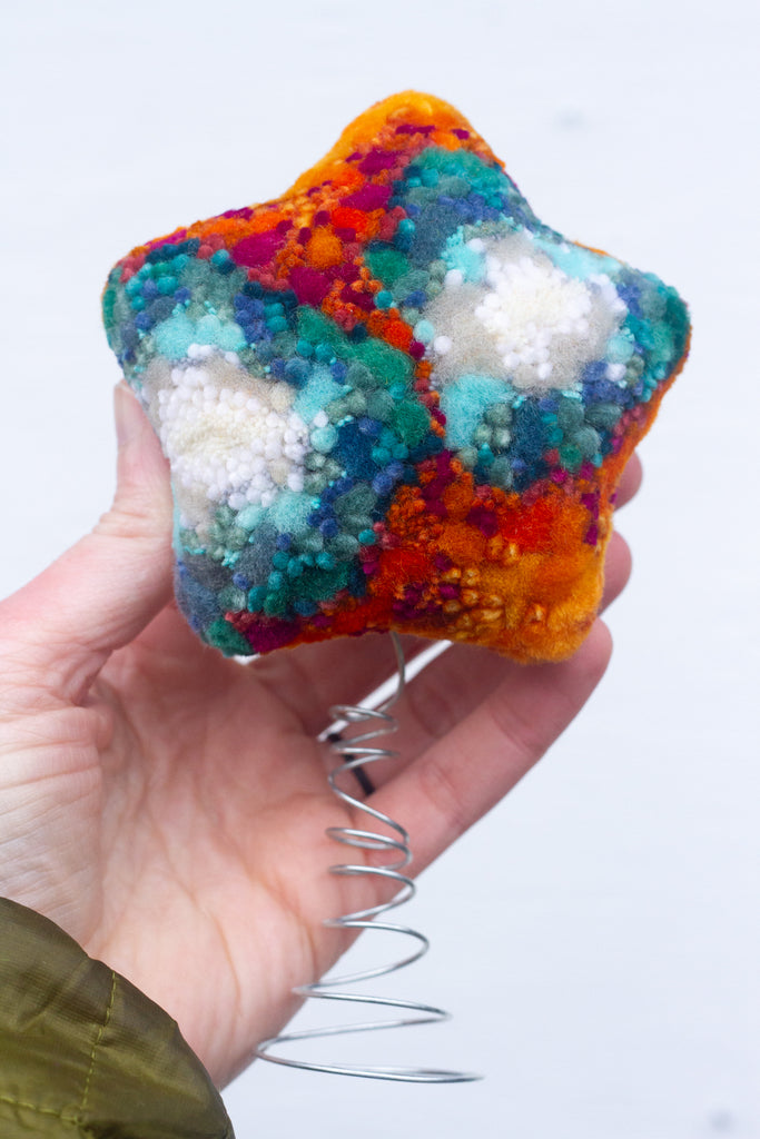 "Puffs" have been an exploration into my way of framing fiber art + this star shape was just begging to become a tree topper.  I am so excited for how fun these turned out!