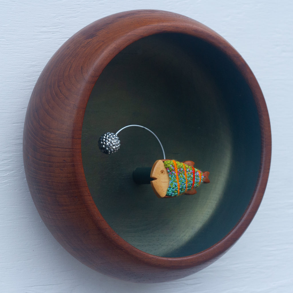 I stitched the center in my favorite French Knots and used a truly special, extra chunky and extra deep, teak bowl to pull it all together. The fish frames are handmade by a couple down in Florida, they're amazing and so fun to incorporate into my work. I love all the details in this piece and believe that larger size will really add a bold impact to wherever you choose to display it.