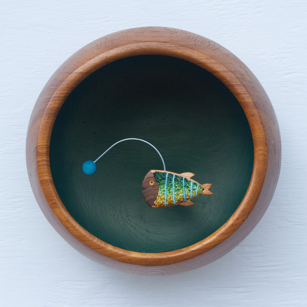 I stitched the center in my favorite French Knots and used a truly special, extra chunky and extra deep, teak bowl to pull it all together. The fish frames are handmade by a couple down in Florida, they're amazing and so fun to incorporate into my work. I love all the details in this piece and believe that larger size will really add a bold impact to wherever you choose to display it.