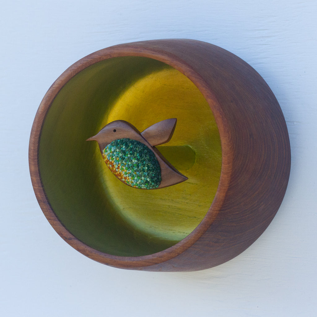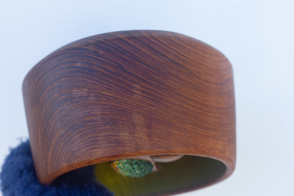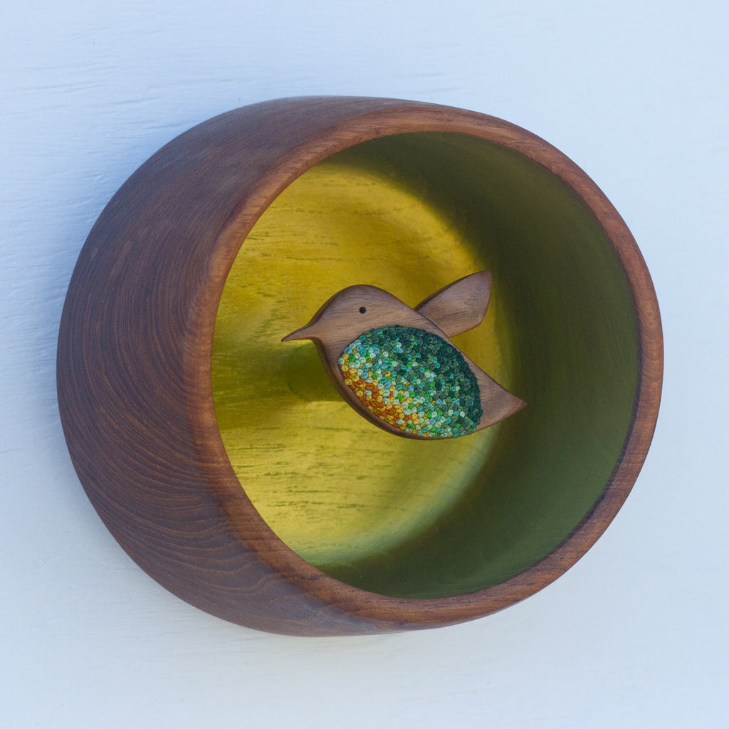 I stitched the center in my favorite French Knots and used a vintage Teak bowl as the outer frame