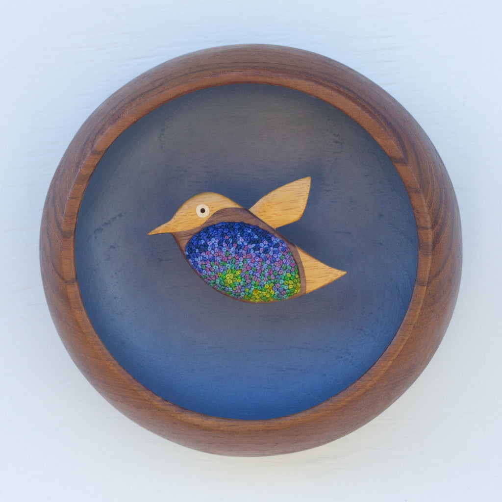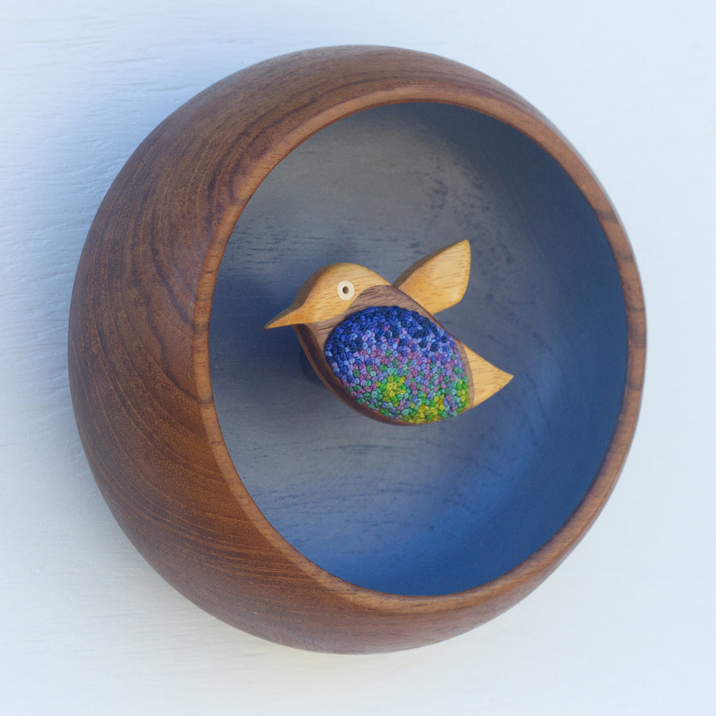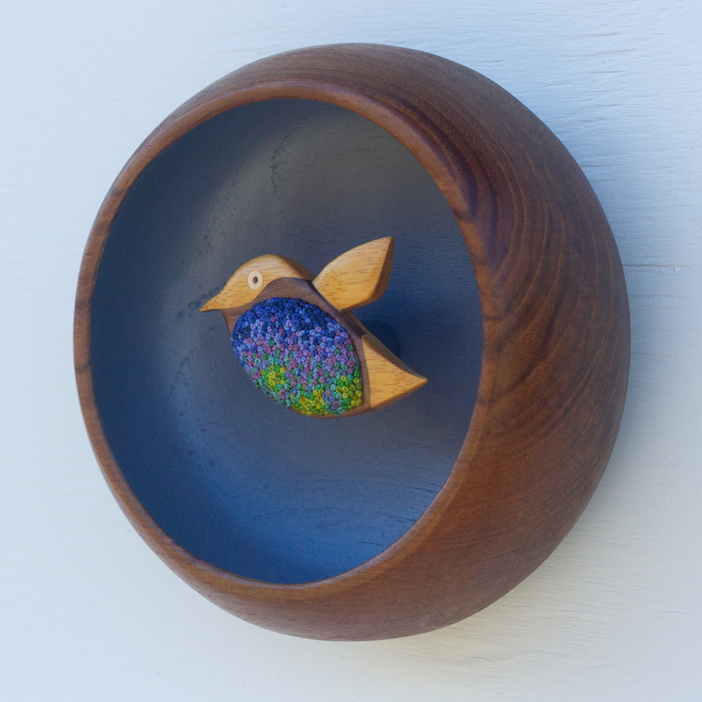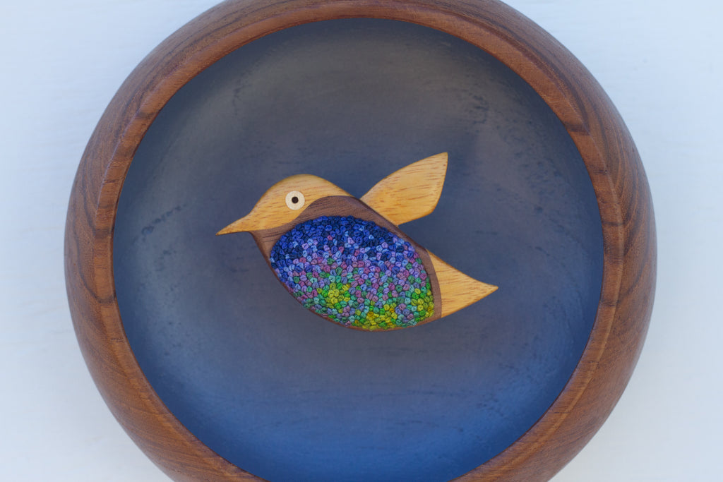 I stitched the center in my favorite French Knots and used a vintage Teak bowl as the outer frame. I love how the teak of the outer frame helps accent the colors in the hummingbird.