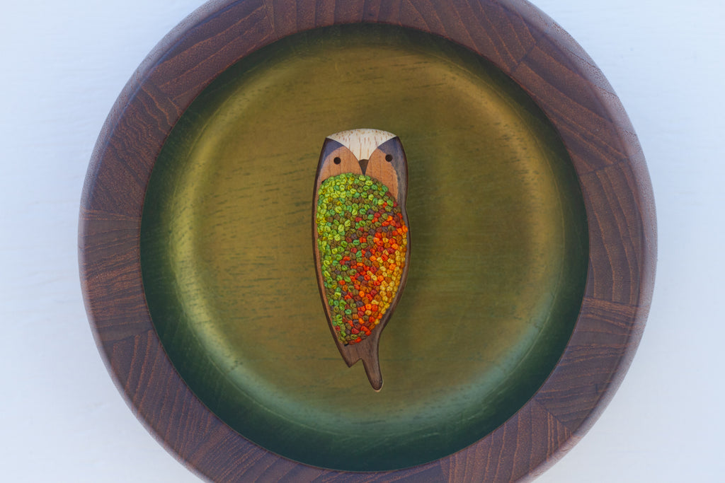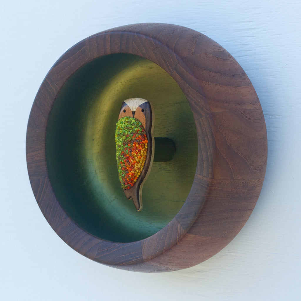 I stitched the center in my favorite French Knots and used a vintage bowl in a fun, chunky Teak as the outer frame. I love how the outer frame helps accent the mix of woods showcased in the owl!