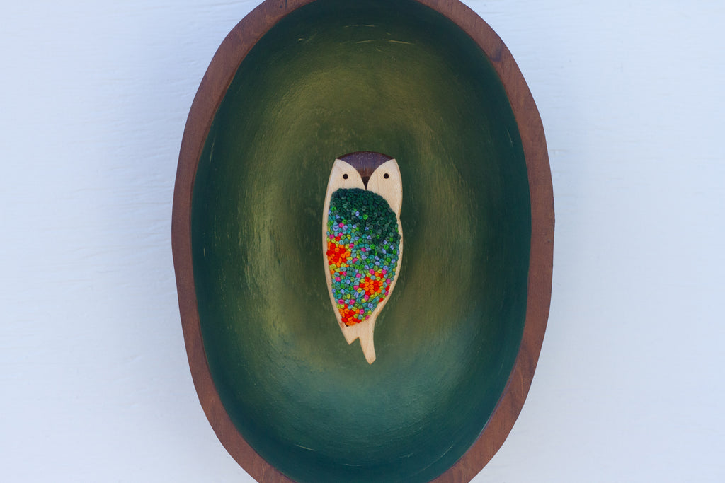 I stitched the center in my favorite French Knots and used a vintage Teak bowl in a fun oval shape as the outer frame. I love how the teak of the outer frame helps accent that dark face of the owl.