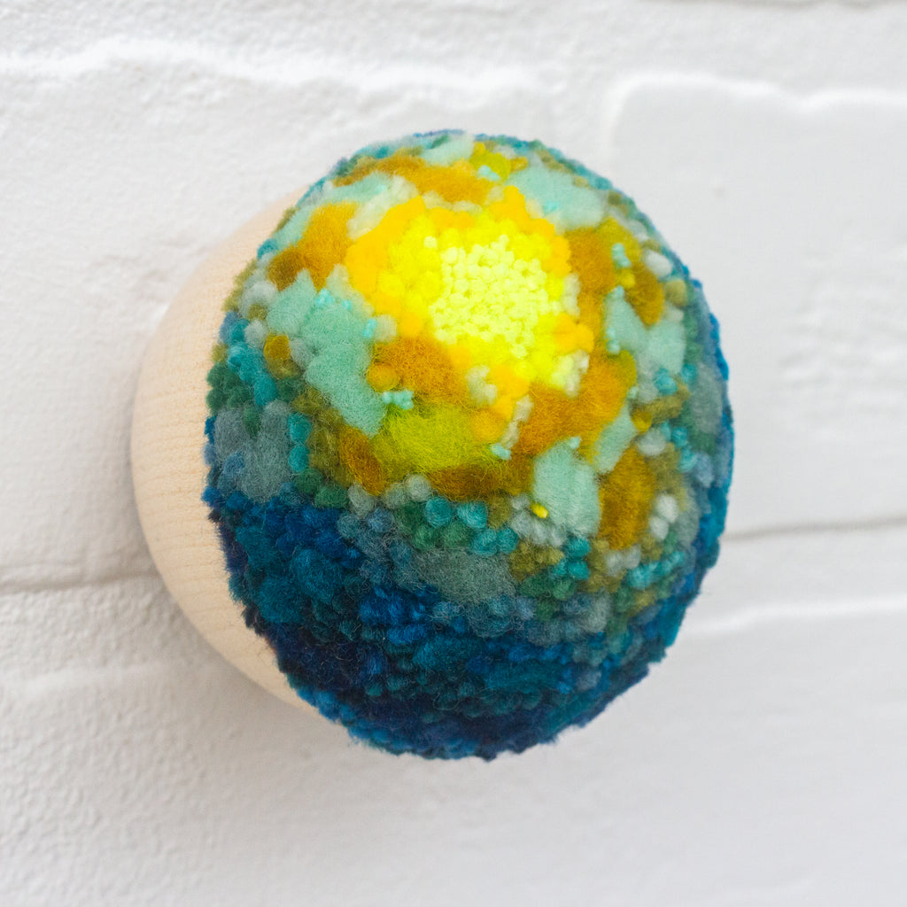 There is a small, drilled hole on the back that will let you hang the piece flush against the wall with a single, brad style nail OR lay it flat as a sort of fiber art sculpture or faux plant in your favorite spot!
