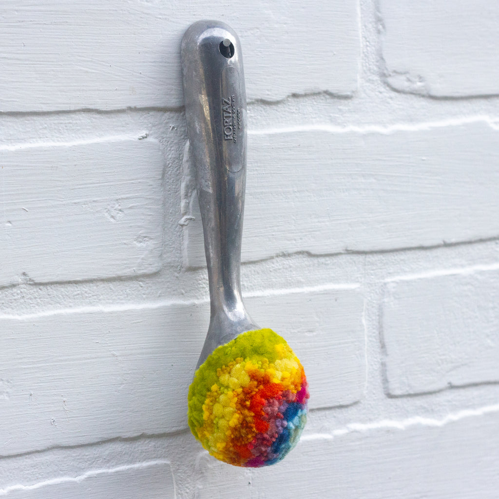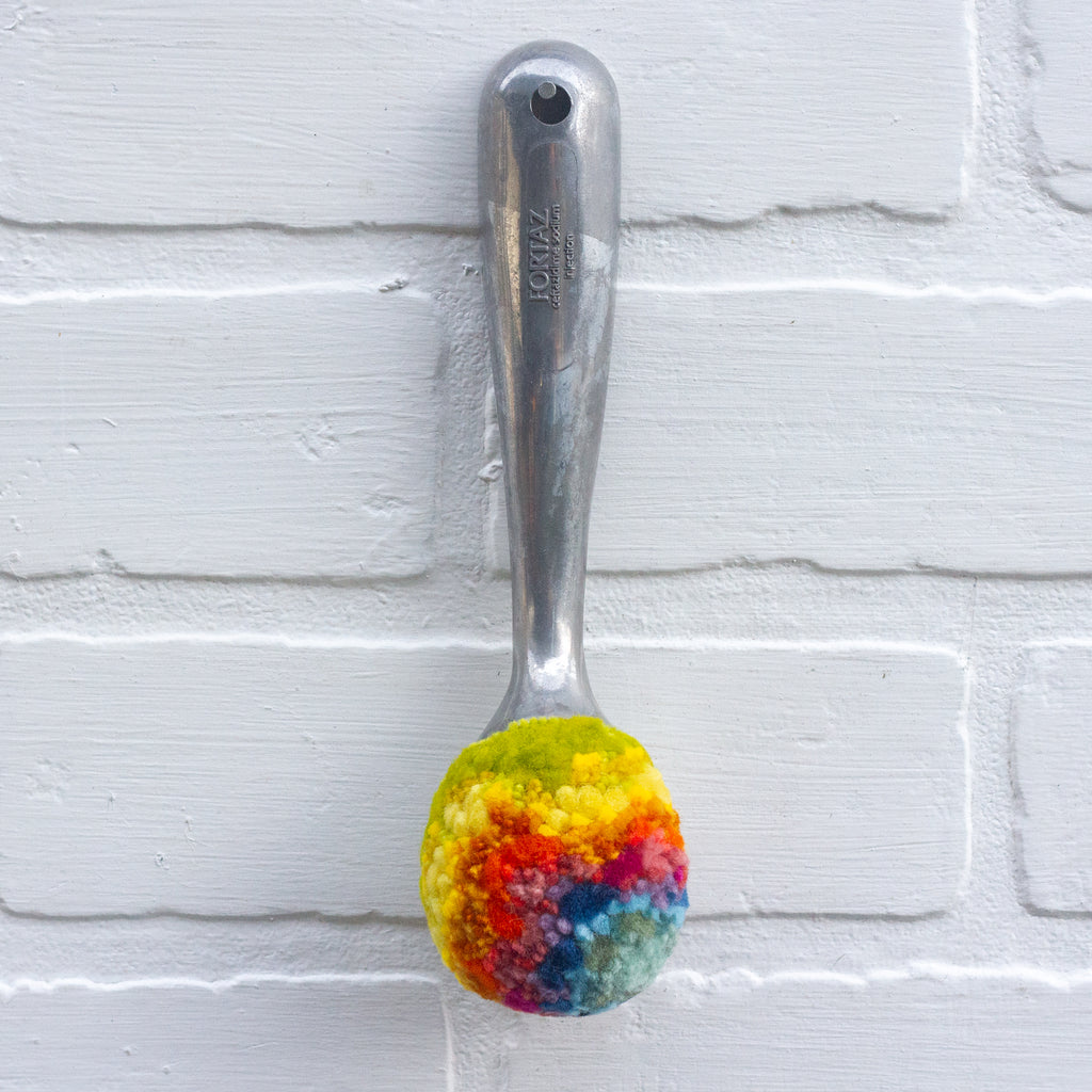 This scoop is so joyful! Looks great hanging up, laying down as a sculpture or place it in a cool cup or glass jar to really show off the whole piece too! All the fibers within the frame have been sourced from small businesses and put together to create a fun piece of fiber art that is fully contained!