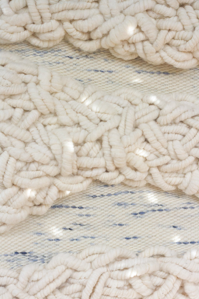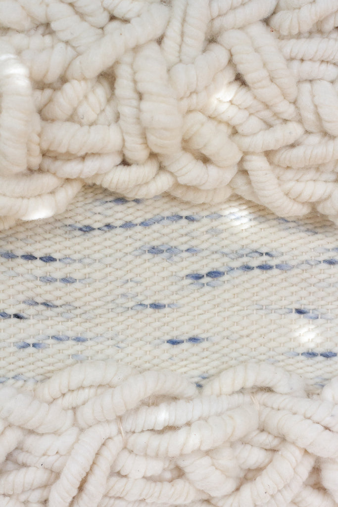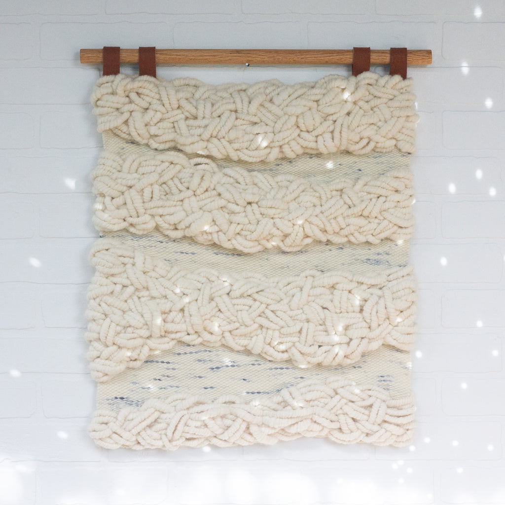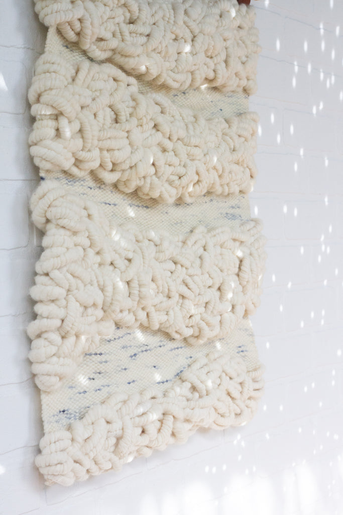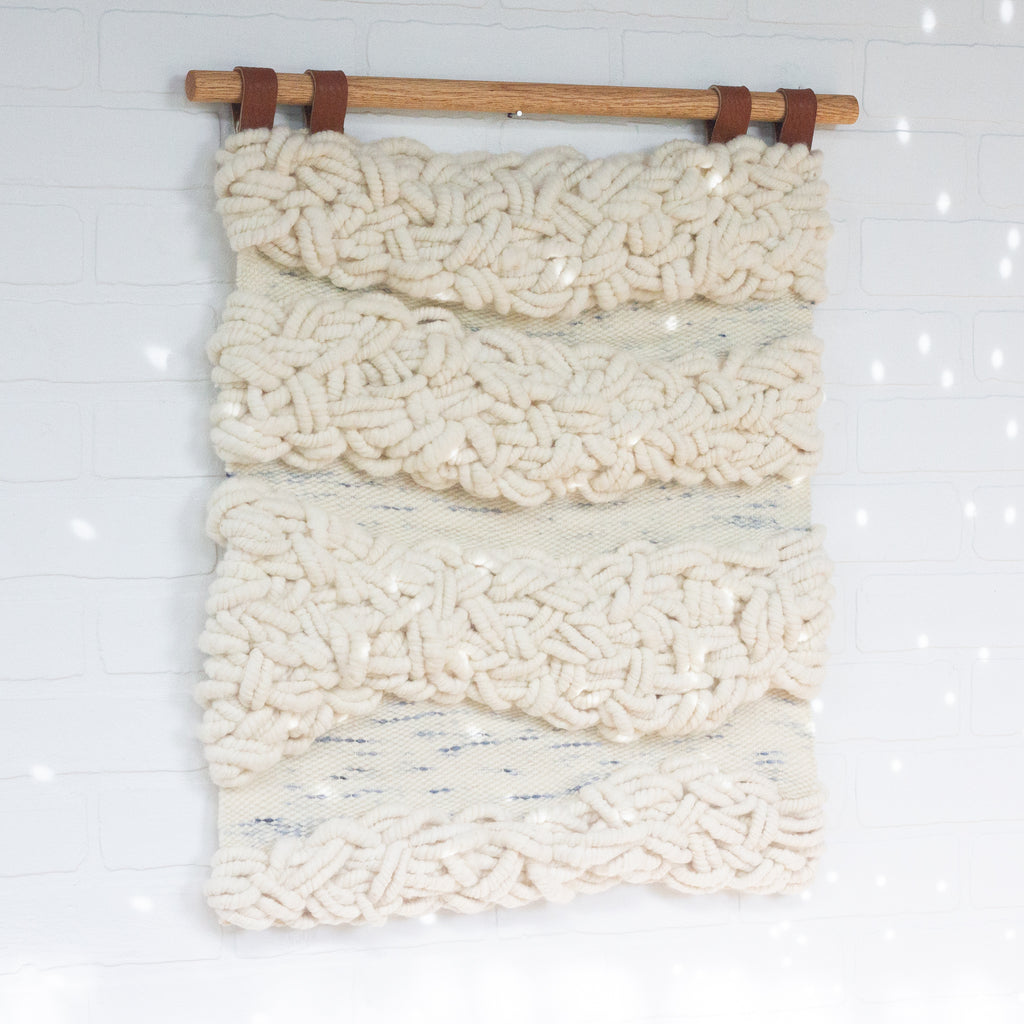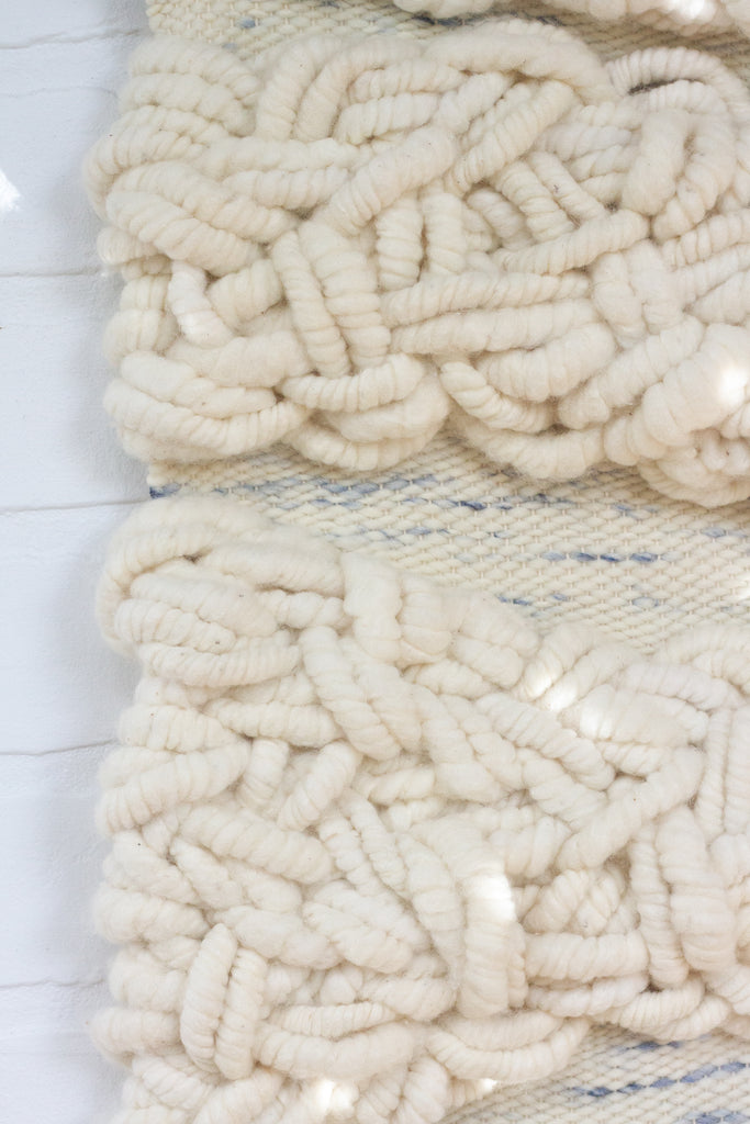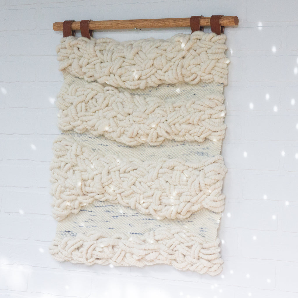 This Large Woven Wall Hanging was woven on a frame loom using all natural materials. The chunky sections are made up of the most delicious cotton + merino mixed core spun yarn and the flat woven areas are a natural wool yarn with indigo drops throughout.