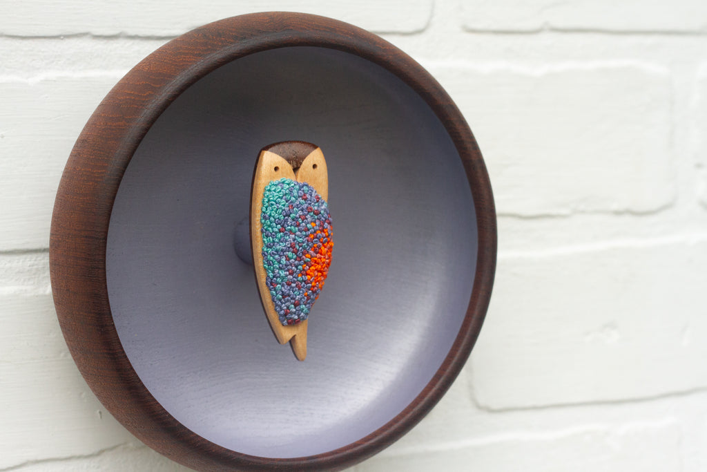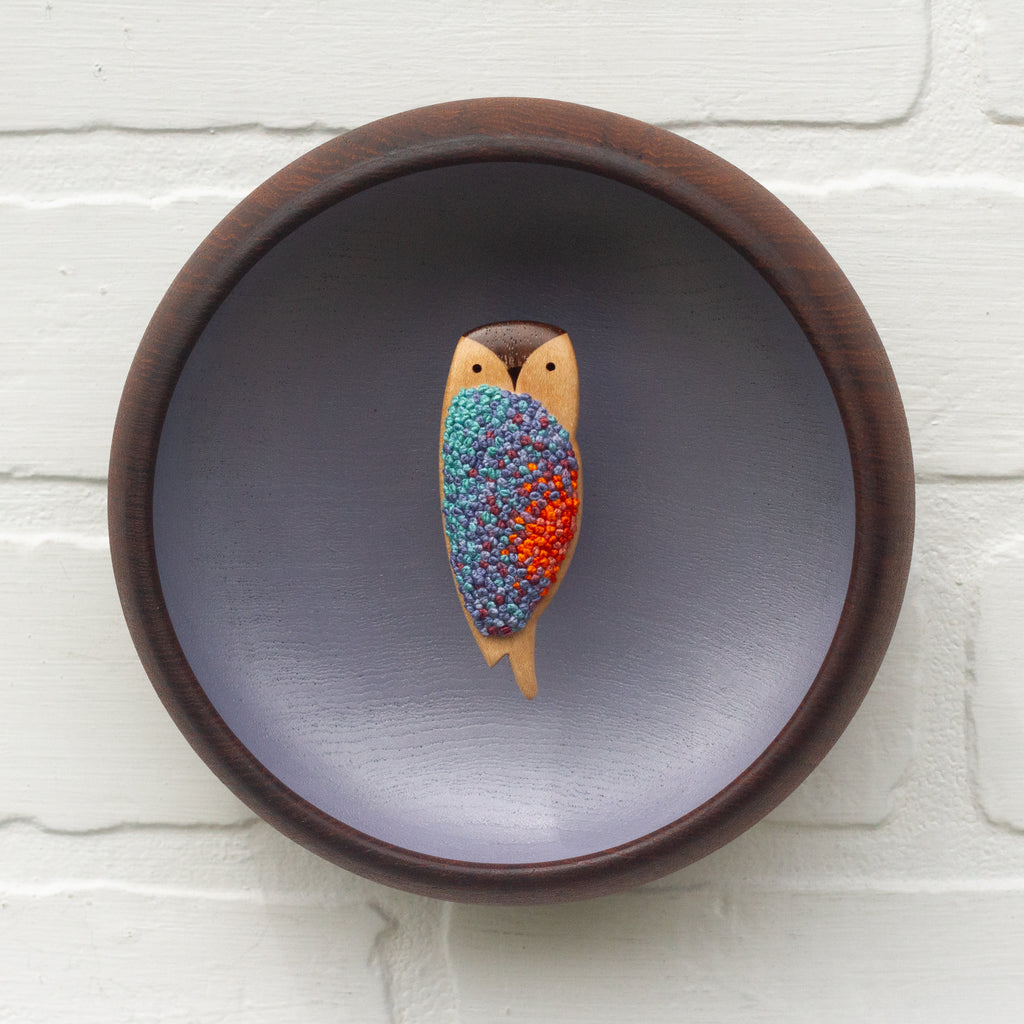 I stitched the center in my favorite French Knots and used dark, vintage Teak bowl as the outer frame. I love how the dark teak of the outer frame helps accent that dark face of the owl.